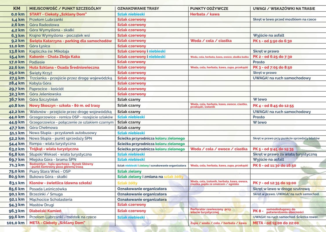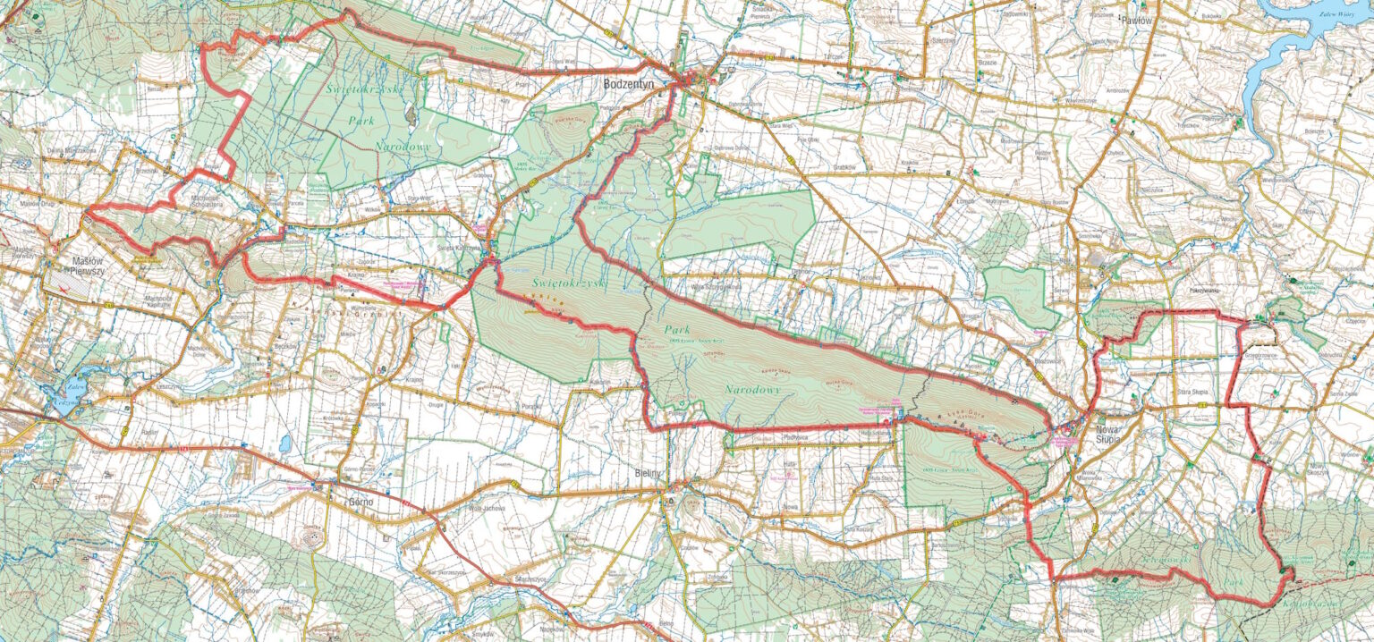 Ciekoty - Przełom Lubrzanki - G. Radostowa - G. Wymyślona – Krajno - Święta Katarzyna - G. Łysica - Przełęcz Św. Mikołaja – Kakonin - Huta Szklana - Święty Krzyż – Trzcianka - Kobyla Góra – Paprocice - Jeleniowska Góra - Przełęcz Jeleniowska - G. Szczytniak - Stary Skoszyn – Wałsnów – Grzegorzowice - Chełmowa Góra - Nowa Słupia – Rampa – Trójkąt - Słupski Weksel - Miejska Góra – Bodzentyn - Psary Podlesie - Bukowa Góra – Klonów - G. Czostek – Brzezinki - Mąchocice Scholasteria - Masłów Drugi - G. Klonówka - Diabelski Kamień - G. Dąbrówka – Ameliówka / Przełom Lubrzanki - Ciekoty
