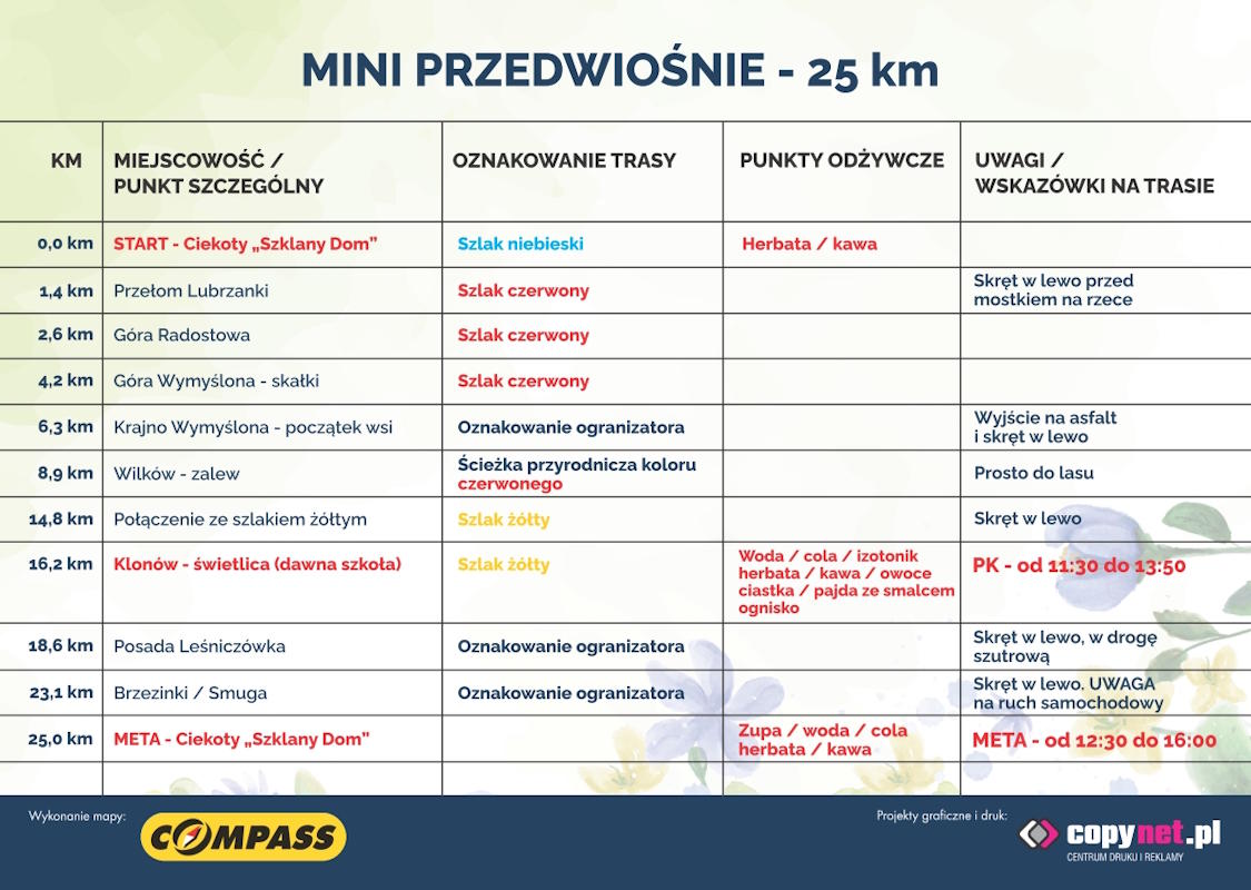 Festiwal Pieszo-Biegowy PRZEDWIOŚNIE – trasa 25km Zapraszamy do zakładki poświęconej trasie nr 1 – Mini Przedwiośnie, gdzie znajdziesz szczegółowe informacje na temat naszego malowniczego szlaku Slad GPX, przebieg i profil trasy