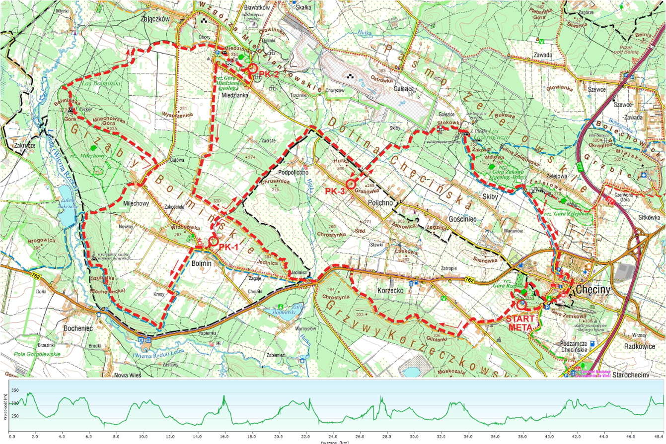 ok. 150km (16% - asfalt, 84% drogi leśne i gruntowe, ścieżki)